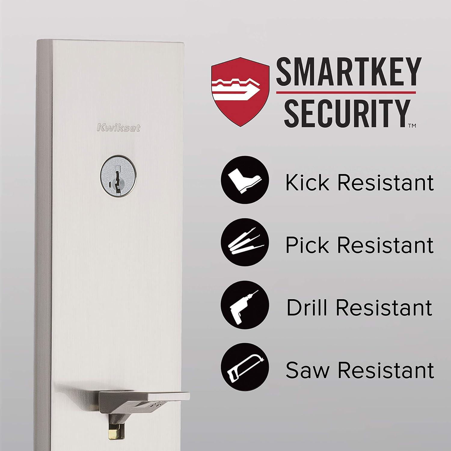 Step up to designer styles and superior security with Kwikset Signature Series products. The Vancouver handle set has a clean, low profile design. With this sleek contemporary style, you make a bold statement right at the front door. The latch bolt is operated by the thumb piece on the outside and the grip on the inside. The deadbolt is operated by a key on the outside and a thumb turn on the inside. The rich tones of Iron Black add the finishing touch to this product. The Iron Black finish provides a rich and warm complement to the product’s style. Kwikset and Microban have teamed up to improve the standard for door hardware. Kwikset will now offer protection on select products, inhibiting the growth of on frequently touched door hardware in your home. It can double every 20 minutes on unprotected surfaces, but Kwikset Door Hardware with Microban protection works to continuously fight off particles and protect the hardware. With each and every interaction throughout the day, the products we use can be exposed to particles. Kwikset hardware with Microban product protection at the door. Kwikset's patented SmartKey Security protects against advanced break-in techniques. SmartKey Security allows you to re-key your lock yourself in seconds. SmartKey Security gives you one-key convenience — Re-key your locks yourself so all your doors share one key.