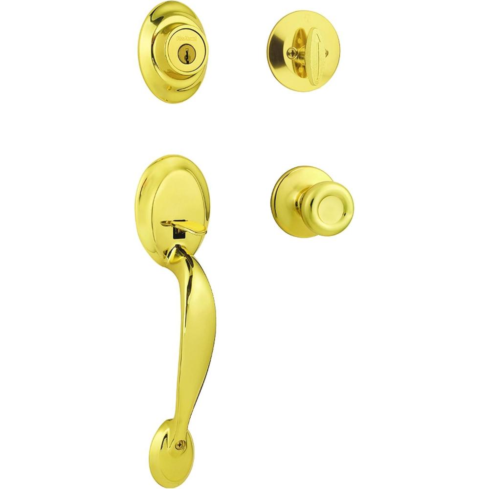 Kwikset Dakota Front Door Lock Handle and Deadbolt Set, Entry Handleset Exterior with Interior Door Knob, Polished Brass, Pick Resistant SmartKey Rekey Deadbolt Security