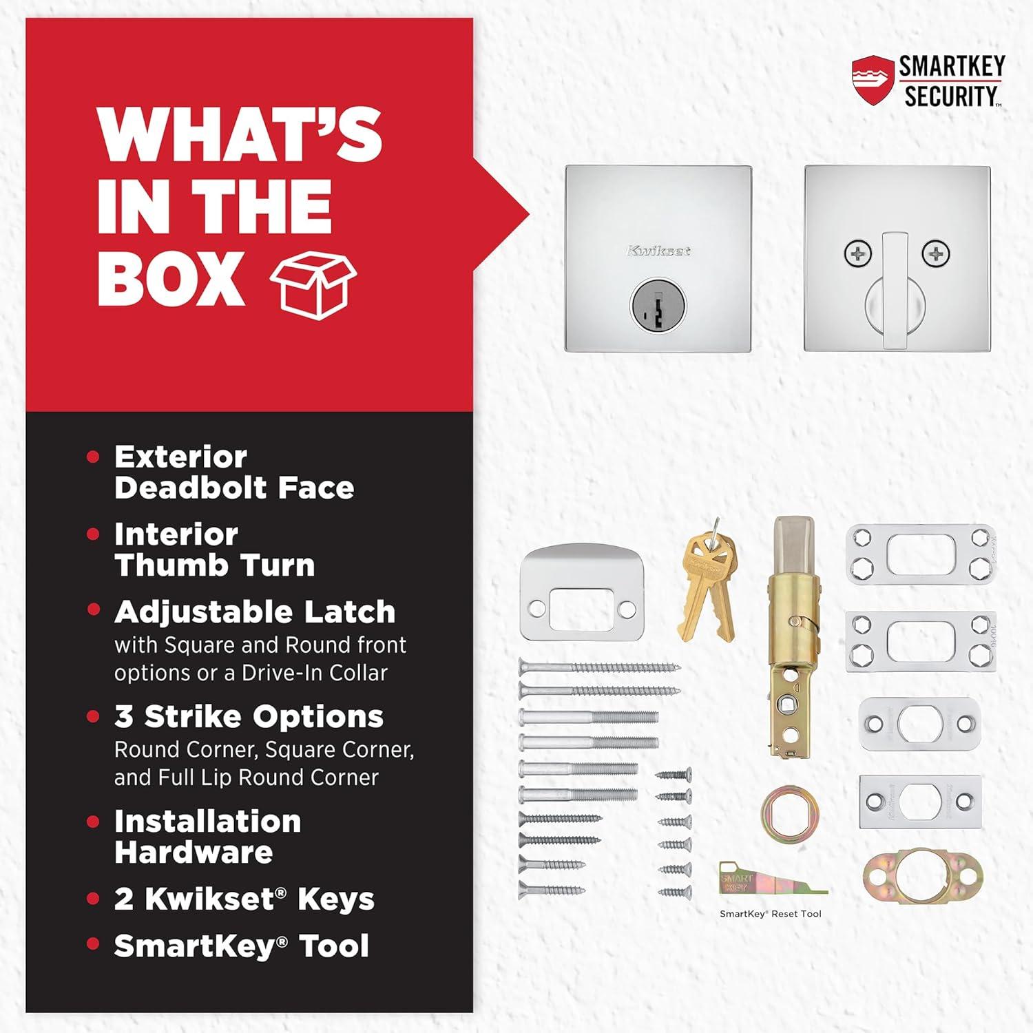 BOX INCLUDES: Exterior Keyed Deadbolt, Interior Turn Piece, Adjustable Latch, 2 Keys, Screws, Strike Plate, SmartKey Tool, Installation Hardware, Install Guide