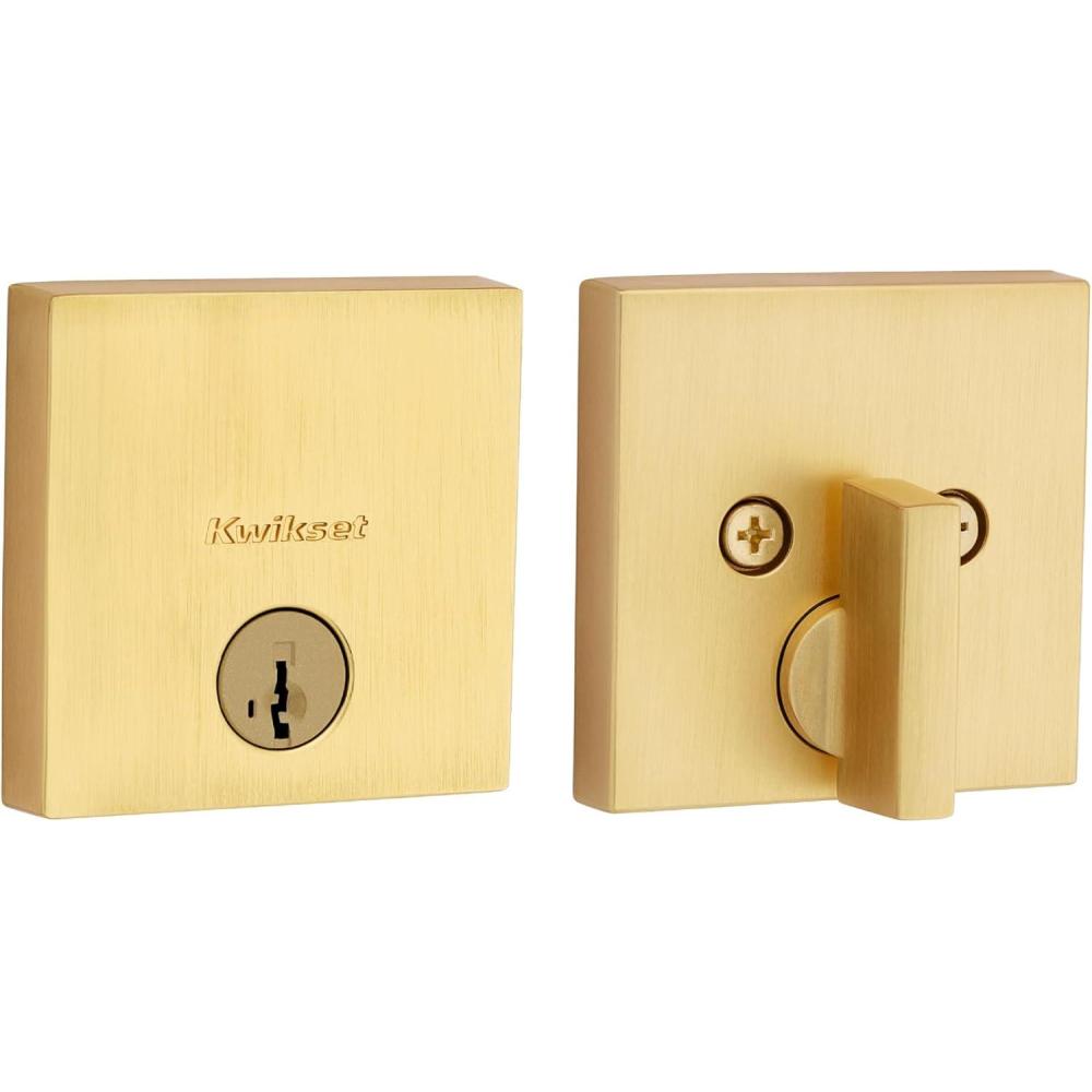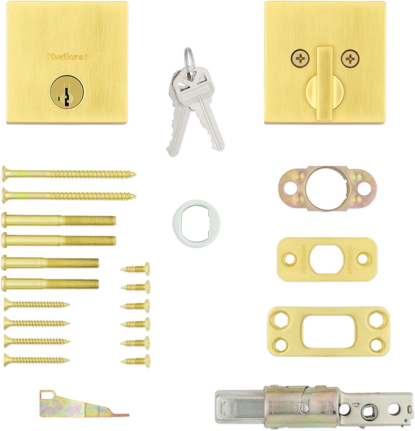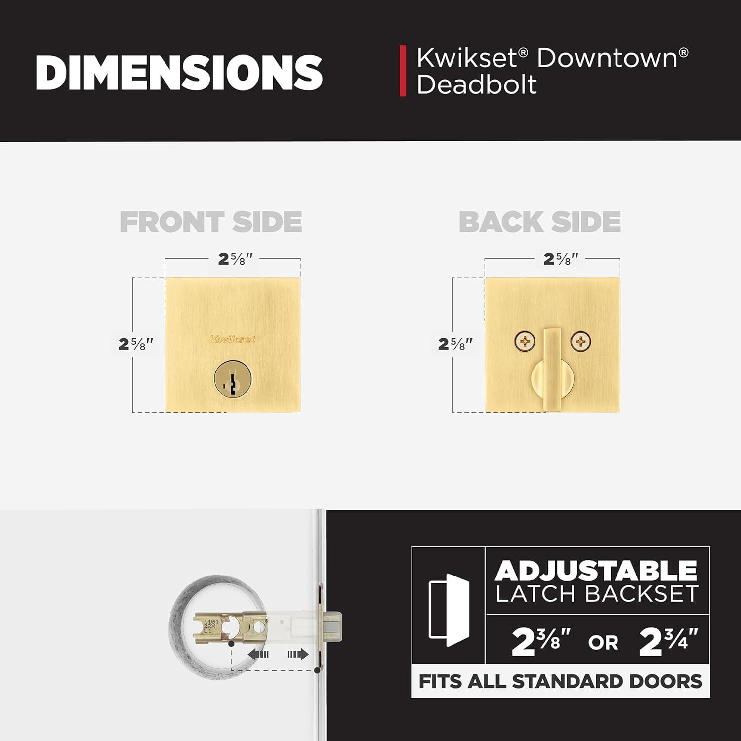 Kwikset Downtown Deadbolt Lock, Satin Brass Square Exterior Keyed Front Entry Door, Pick Resistant SmartKey Rekey Security, Single Cylinder Dead Bolt, with Microban Protection(Satin Brass)