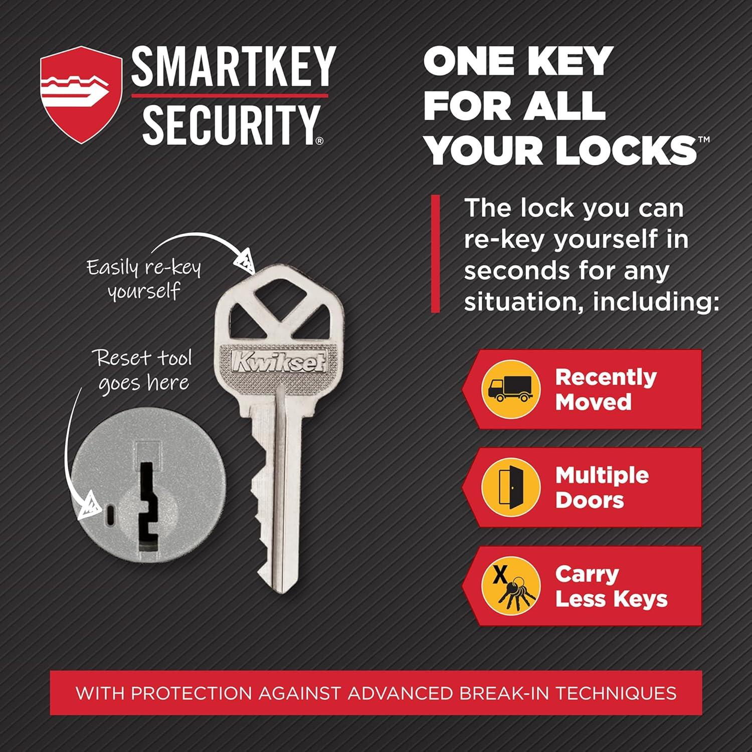SMARTKEY SECURITY: Kwikset’s SmartKey Security technology protects against advanced break-in techniques and allows you to re-key your lock yourself in seconds