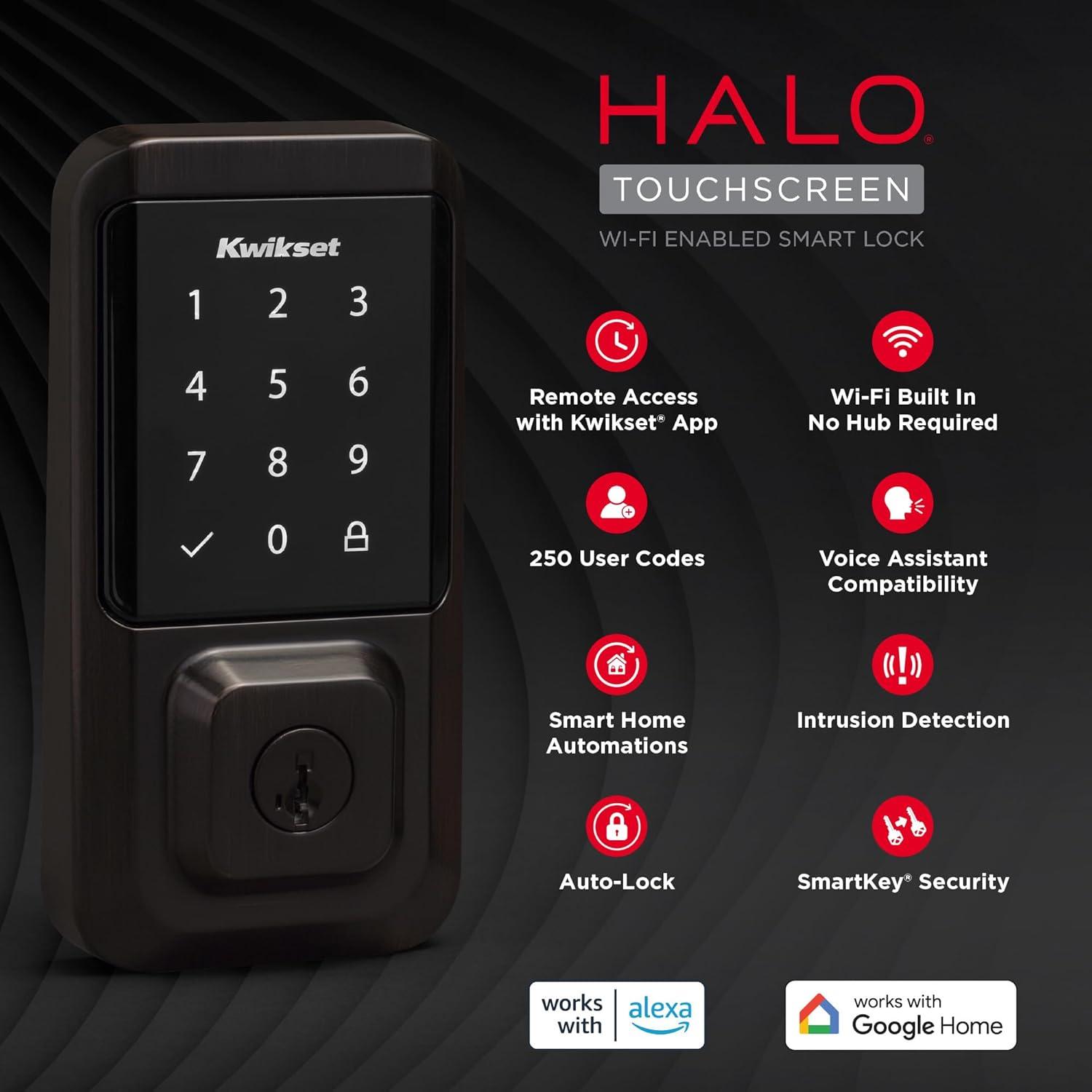 Unlock simplicity, connectivity and smart living with Halo Touchscreen. With the Kwikset app and Halo Touchscreen’s built-in Wi-Fi, you can lock or unlock your home from anywhere. Keyless entry means you can ditch your keys, for good — unlock your door with the Kwikset app or enter a code on the backlit touchscreen. Access codes simplify sharing access with family and trusted guests, and real-time notifications give you peace of mind they’ve locked up after leaving. Experience total control of your front door: Control your lock with your voice, check the event log any time and receive instant notifications for intrusion attempts. It’s easy to get started with Halo Touchscreen; the guided setup and installation only requires a screwdriver. When it comes to security and access control, you can trust Kwikset’s 75 years of experience to deliver effortless protection and peace of mind.