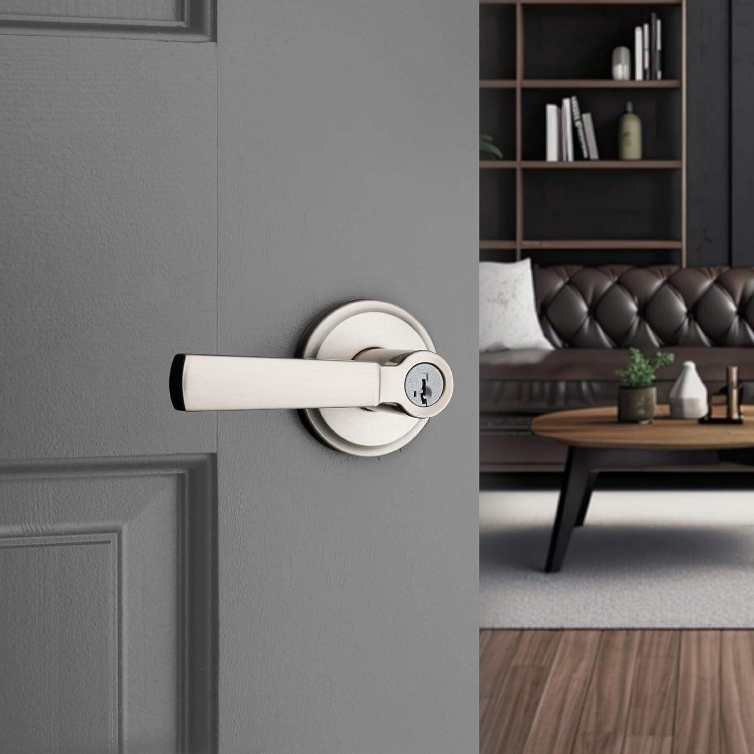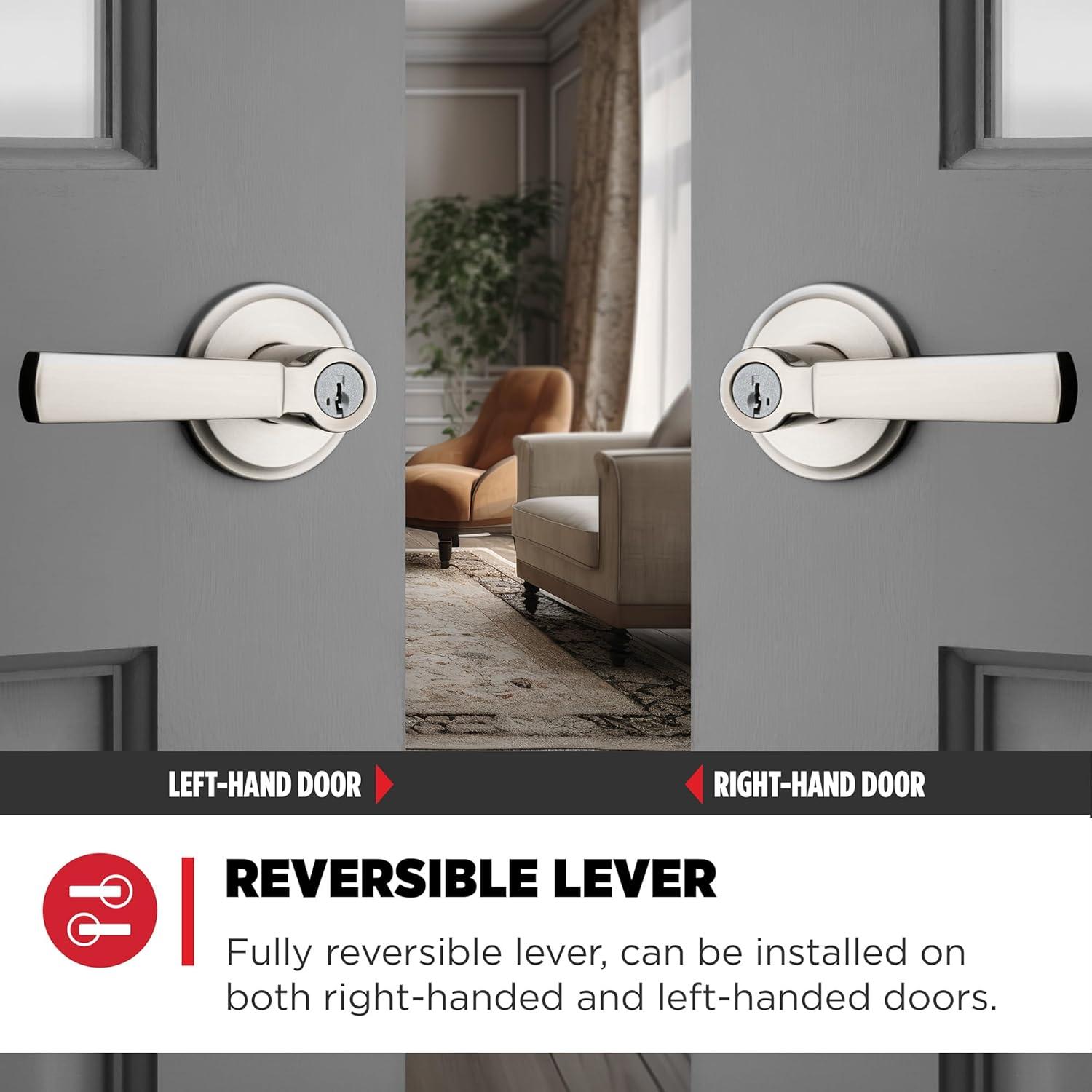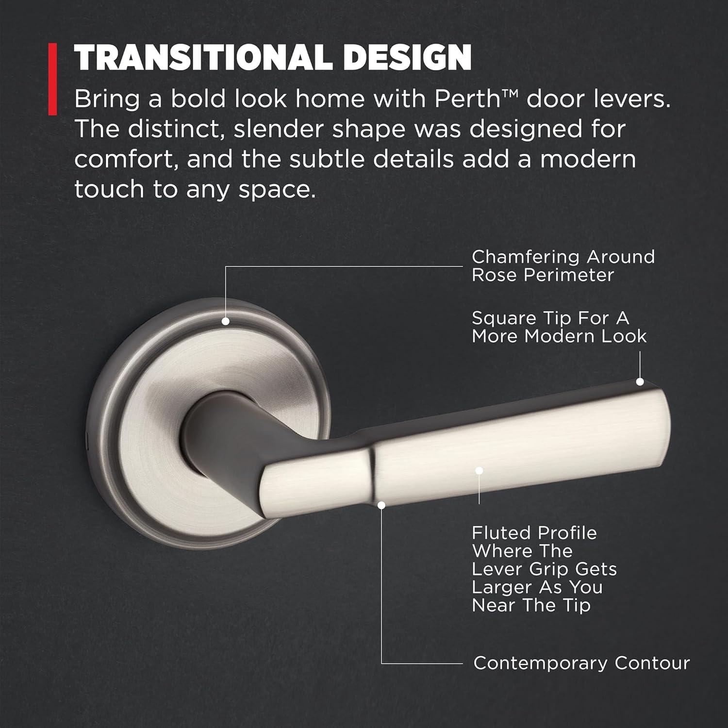 Step up to designer styles and superior security with Kwikset Signature Series products. Bring a bold look home with Perth door levers. The distinct, slender shape was designed for comfort, and the subtle details add a modern touch to any space. Featuring our SmartKey Security on the keyed entry lever and a transitional designer rosette on every lever, Perth protects against common break-in methods while making a style statement. Elevate your interior and exteriors with Perth, and enjoy our highest level of security, easiest installation and peace of mind. This passage knob/lever is best used on interior hall and closet applications where no locking is required, so the knob/lever is always free to turn. The knob/lever is reversible and mounts on both left and right handed doors. The crisp, clean appearance of the Satin Nickel finish adds to the overall look of the product and brings a modern feel.
