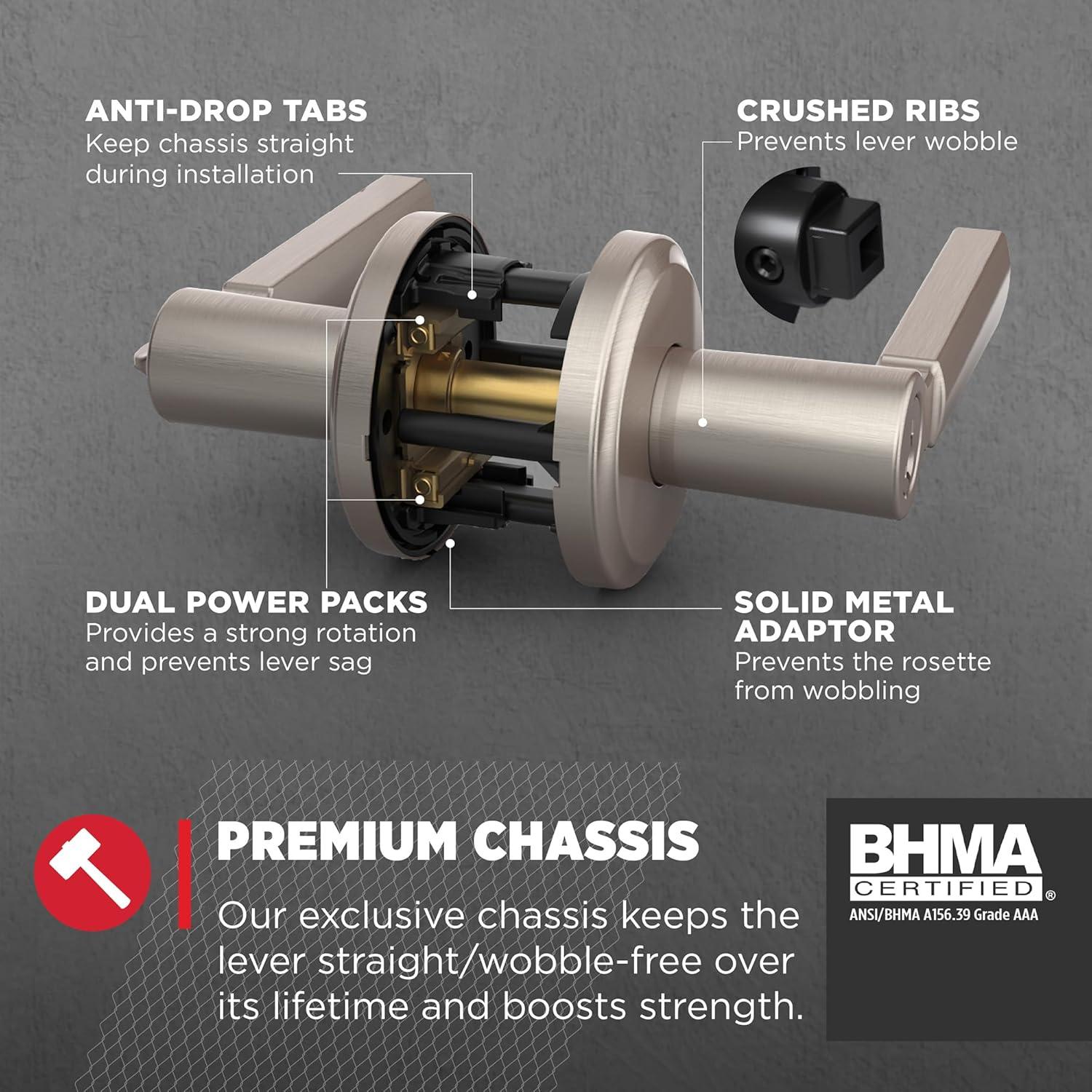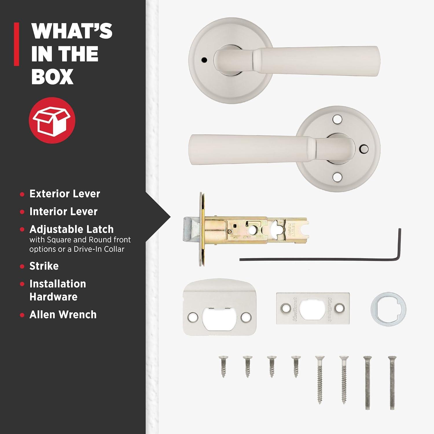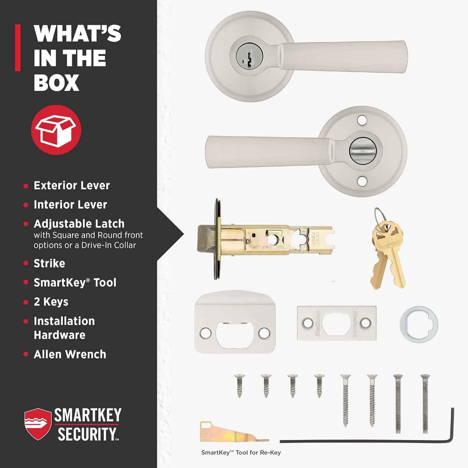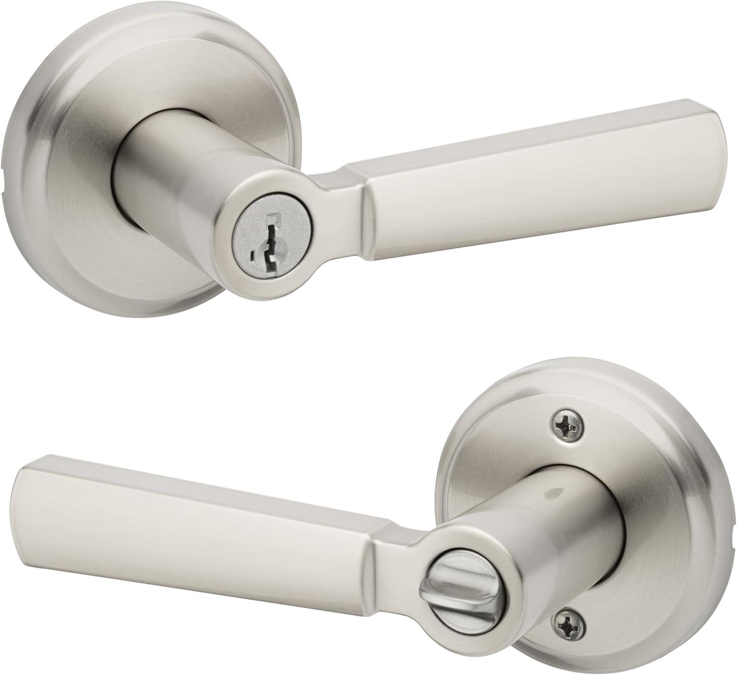 Step up to designer styles and superior security with Kwikset Signature Series products. Bring a bold look home with Perth door levers. The distinct, slender shape was designed for comfort, and the subtle details add a modern touch to any space. Featuring our SmartKey Security on the keyed entry lever and a transitional designer rosette on every lever, Perth protects against common break-in methods while making a style statement. Elevate your interior and exteriors with Perth, and enjoy our highest level of security, easiest installation and peace of mind. This passage knob/lever is best used on interior hall and closet applications where no locking is required, so the knob/lever is always free to turn. The knob/lever is reversible and mounts on both left and right handed doors. The crisp, clean appearance of the Satin Nickel finish adds to the overall look of the product and brings a modern feel.
