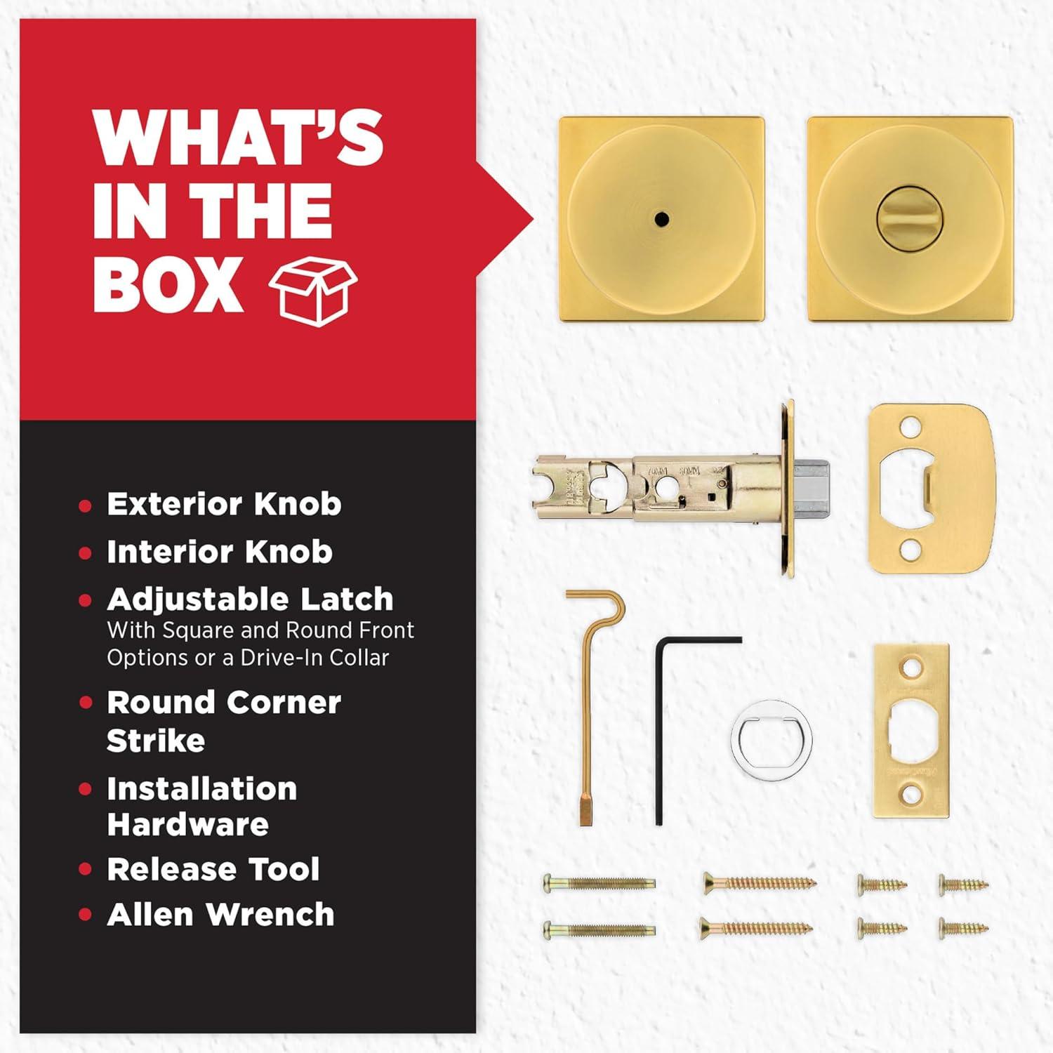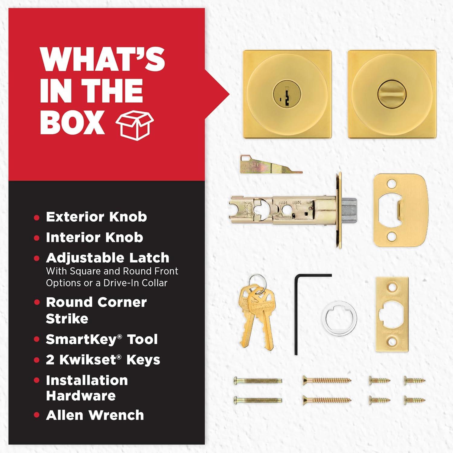BOX INCLUDES: Keyed Exterior Knob, Interior Knob, Screws, Adjustable Latch, 2 Keys, Strike Plate, SmartKey Tool, Installation Hardware, Install Guide