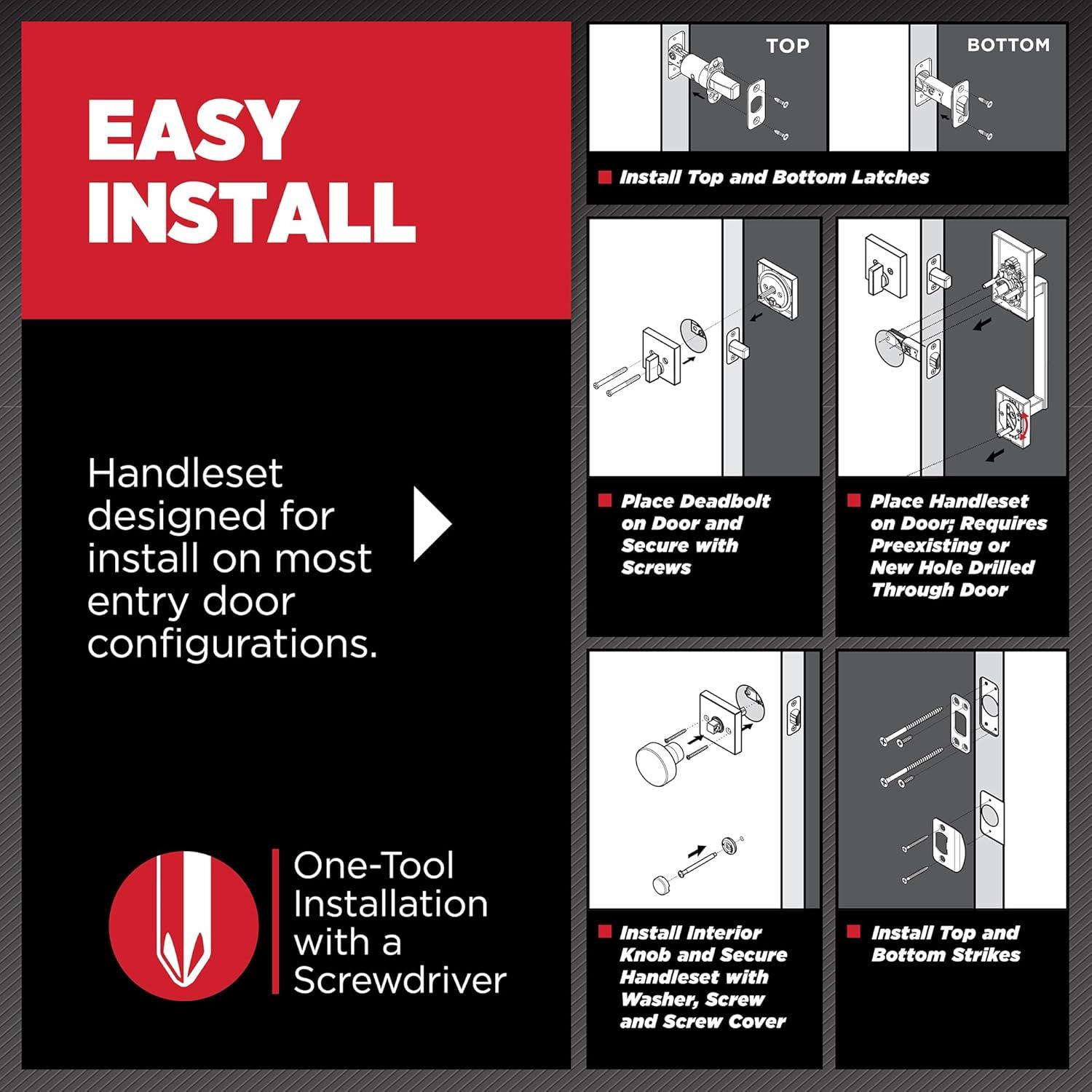 EASY INSTALL: Do it yourself, installs in minutes with just a screwdriver, if door is missing a bottom handleset support hole you will need a drill, directions provided