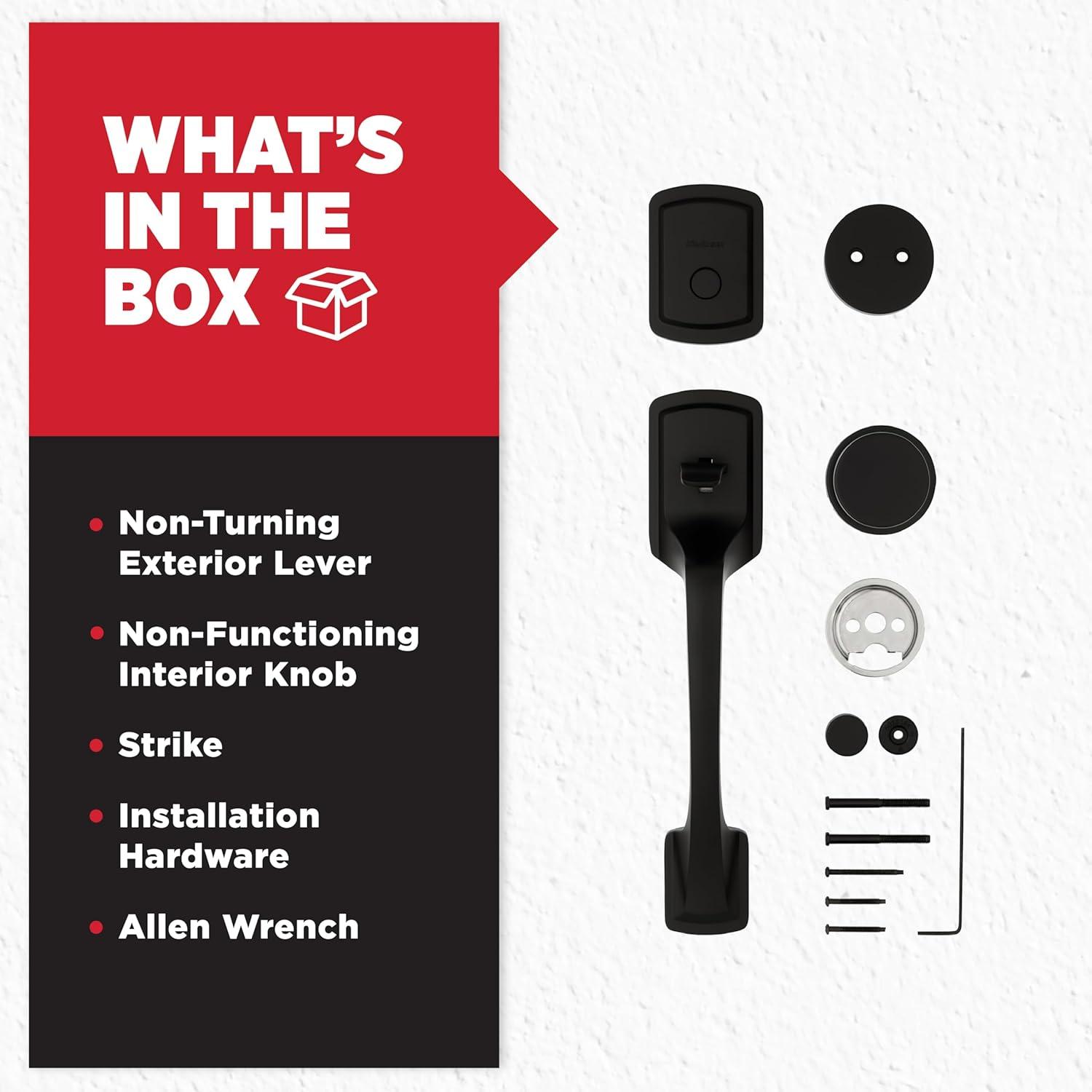 BOX INCLUDES: Exterior Keyed Deadbolt, Handleset, Interior Turn Piece, Interior Knob, Adjustable Latch, 2 Keys, Screws, Strike Plate, SmartKey Tool, Installation Hardware, Install Guide