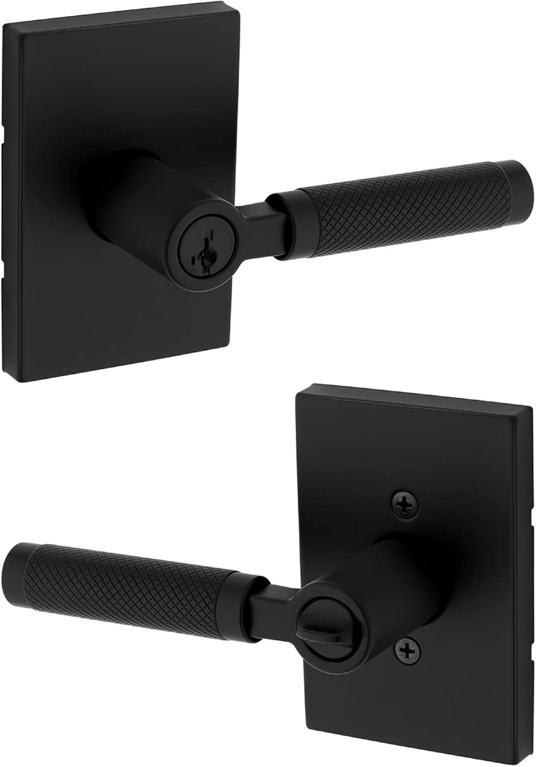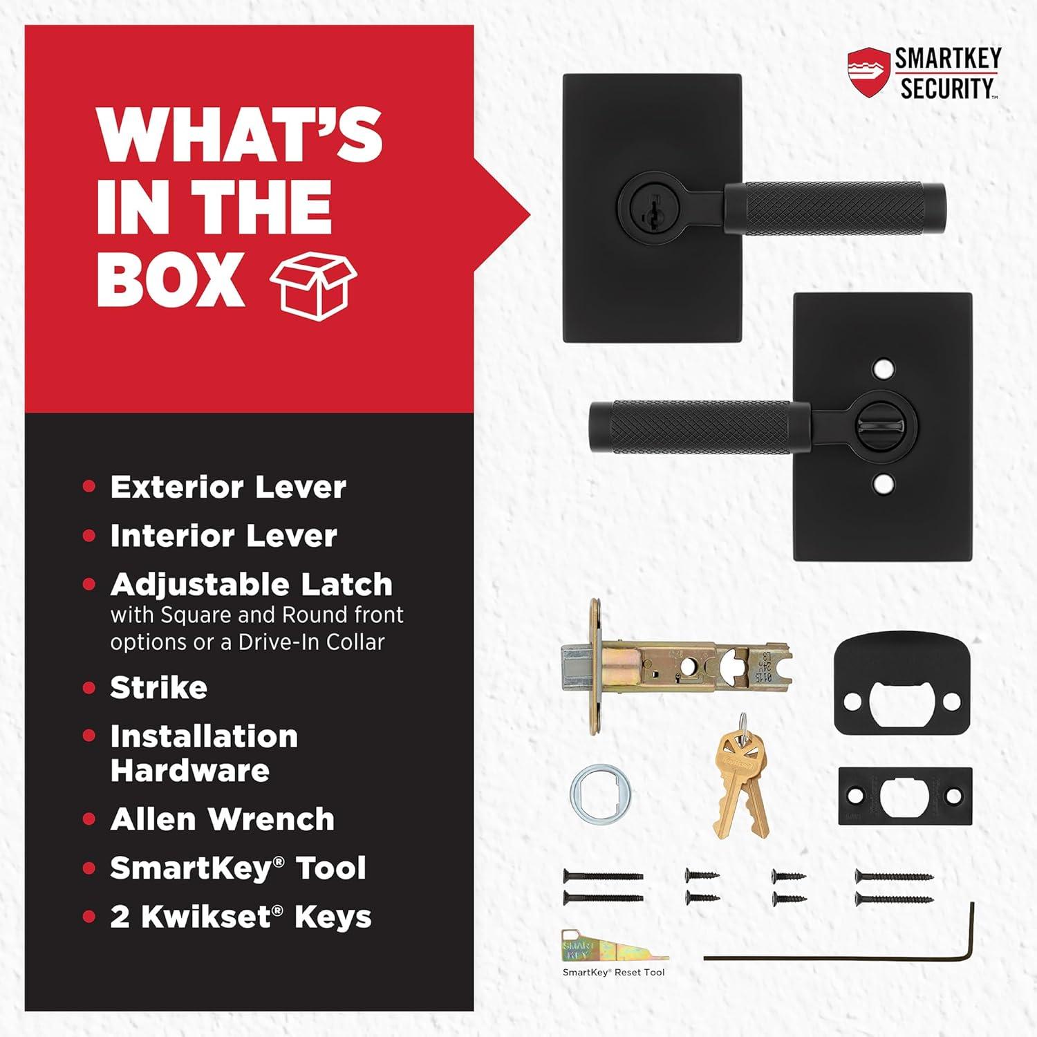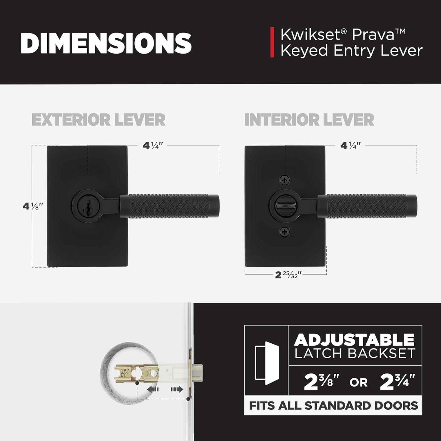 Kwikset Prava Entry Door Knurled Handle with Lock and Key, Secure Keyed Reversible Lever Exterior, for Front Entrance and Bedrooms, Satin Brass, Pick Resistant Smartkey Rekey Security and Microban(Matte Black)