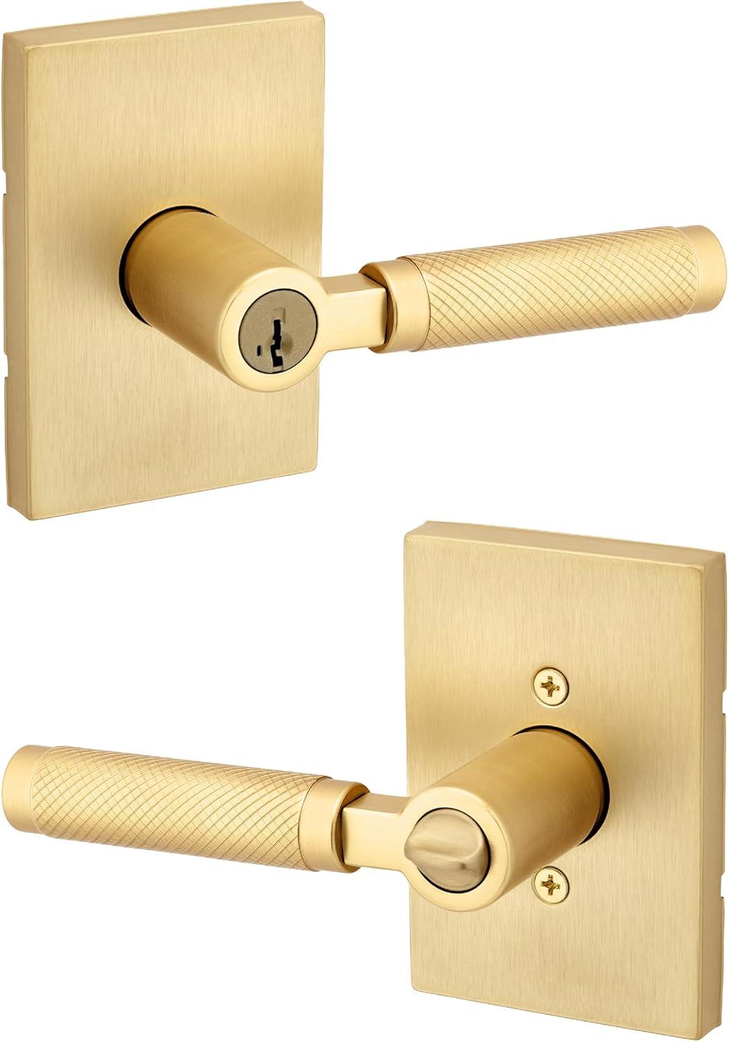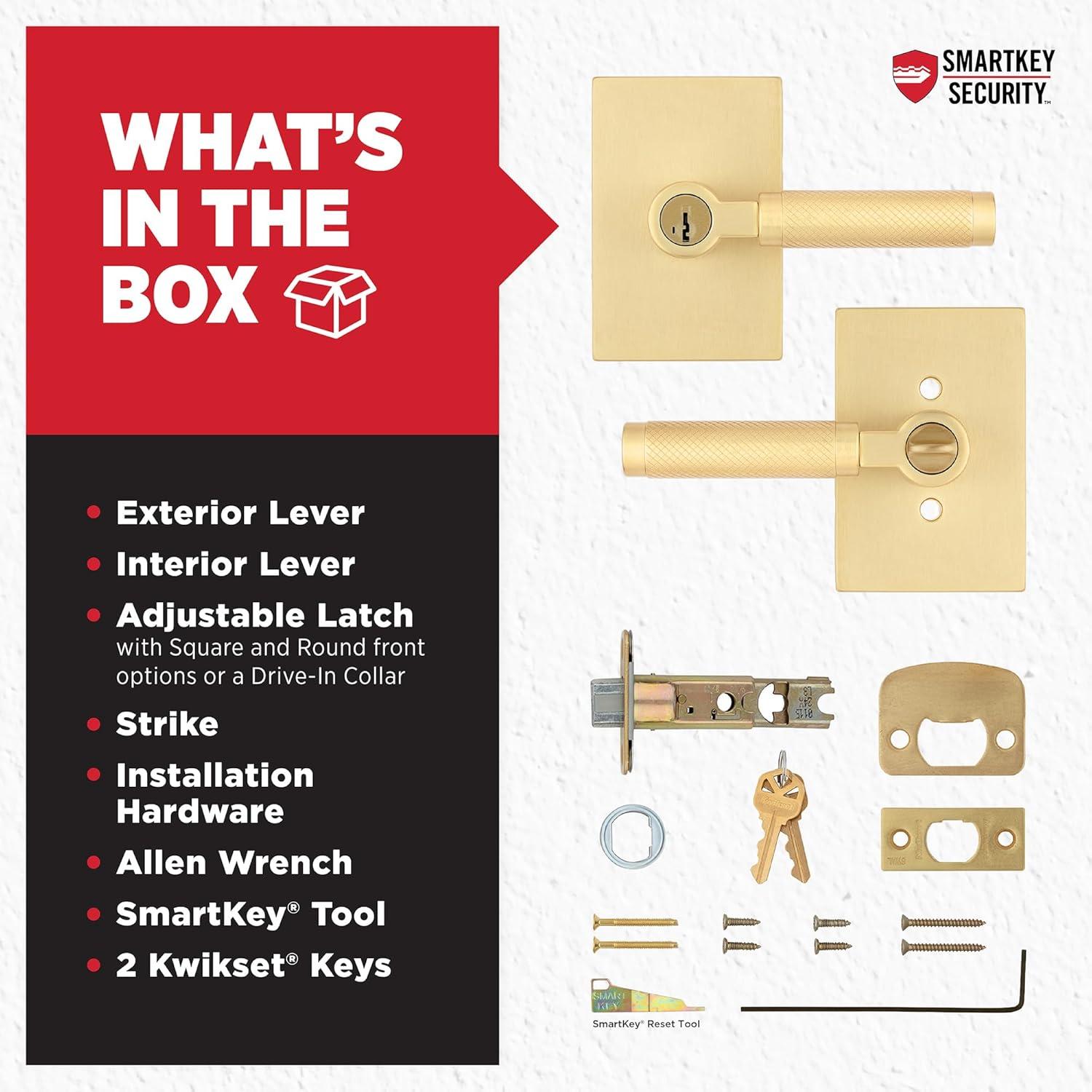 Kwikset Prava Entry Door Knurled Handle with Lock and Key, Secure Keyed Reversible Lever Exterior, for Front Entrance and Bedrooms, Satin Brass, Pick Resistant Smartkey Rekey Security and Microban(Satin Brass)
