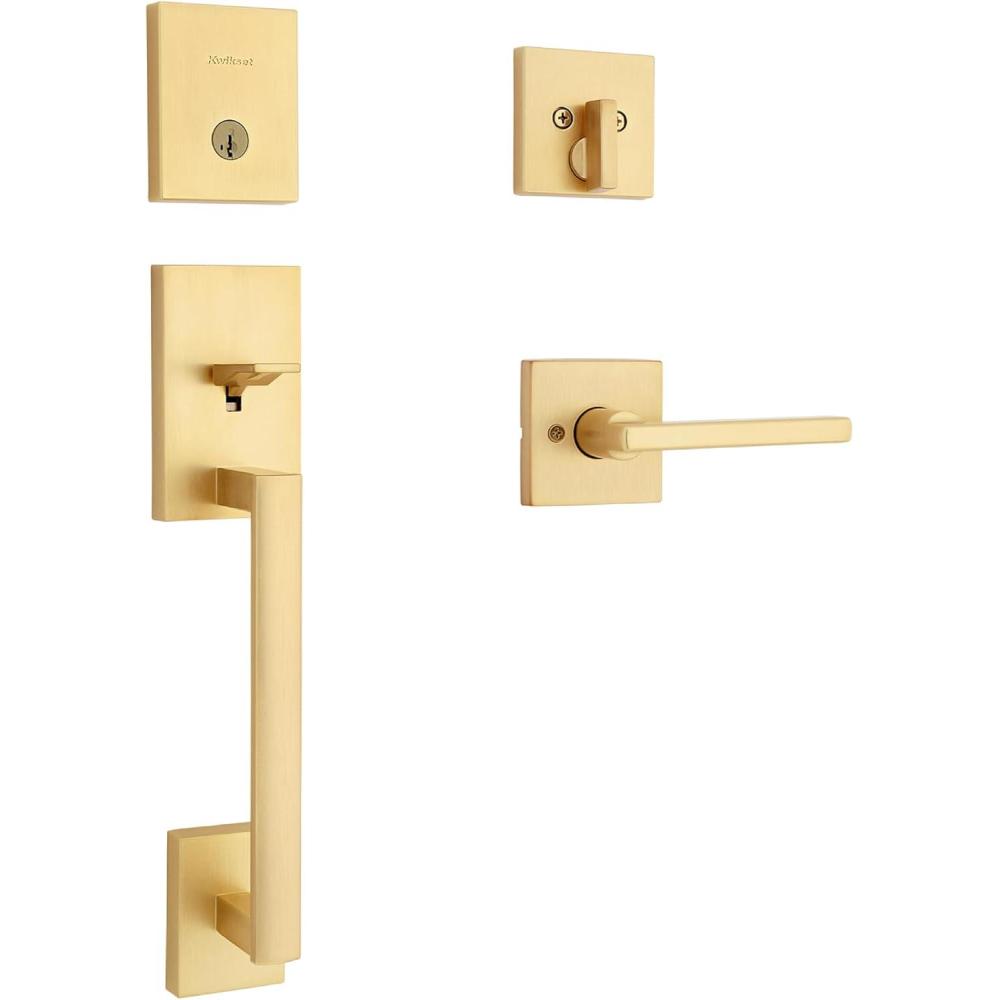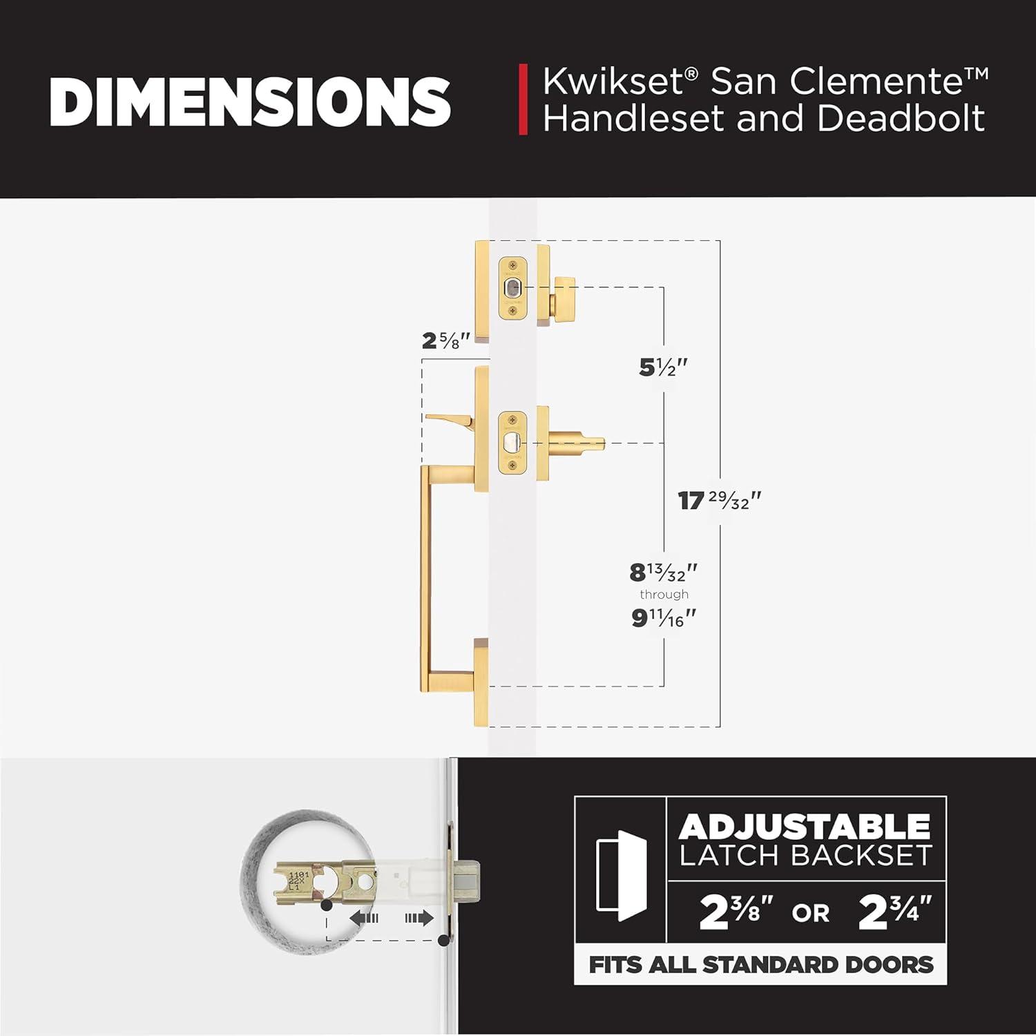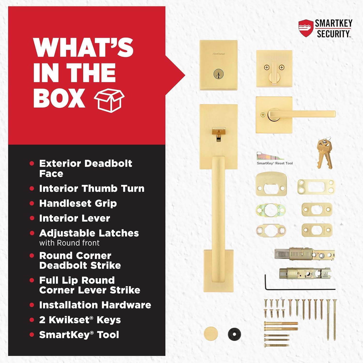 Kwikset San Clemente Front Door Lock Handle and Deadbolt Set, Entry Handleset Exterior with Interior Reversible Lever, Satin Nickel, Pick Resistant SmartKey Rekey Deadbolt Security(Satin Brass)