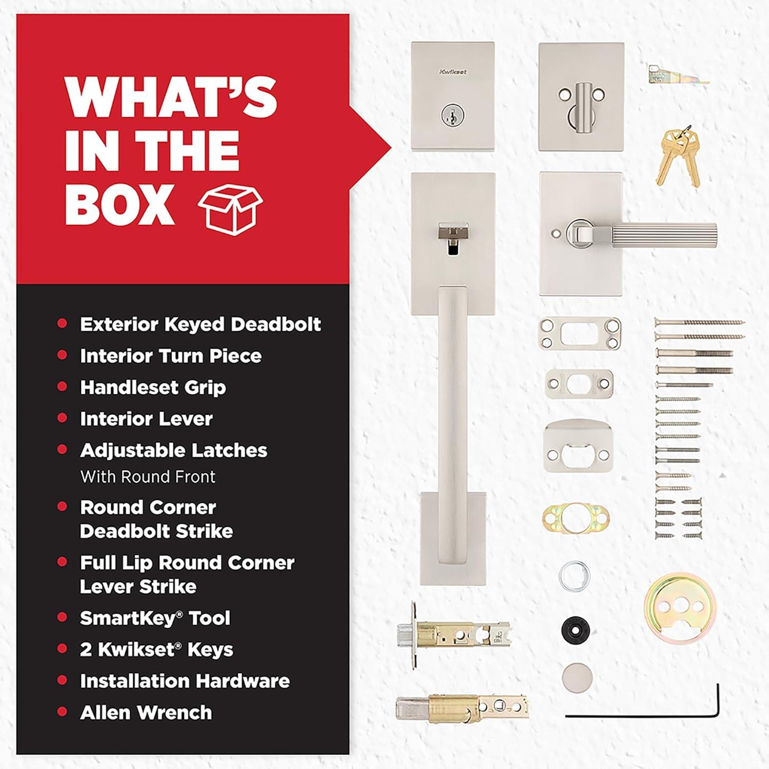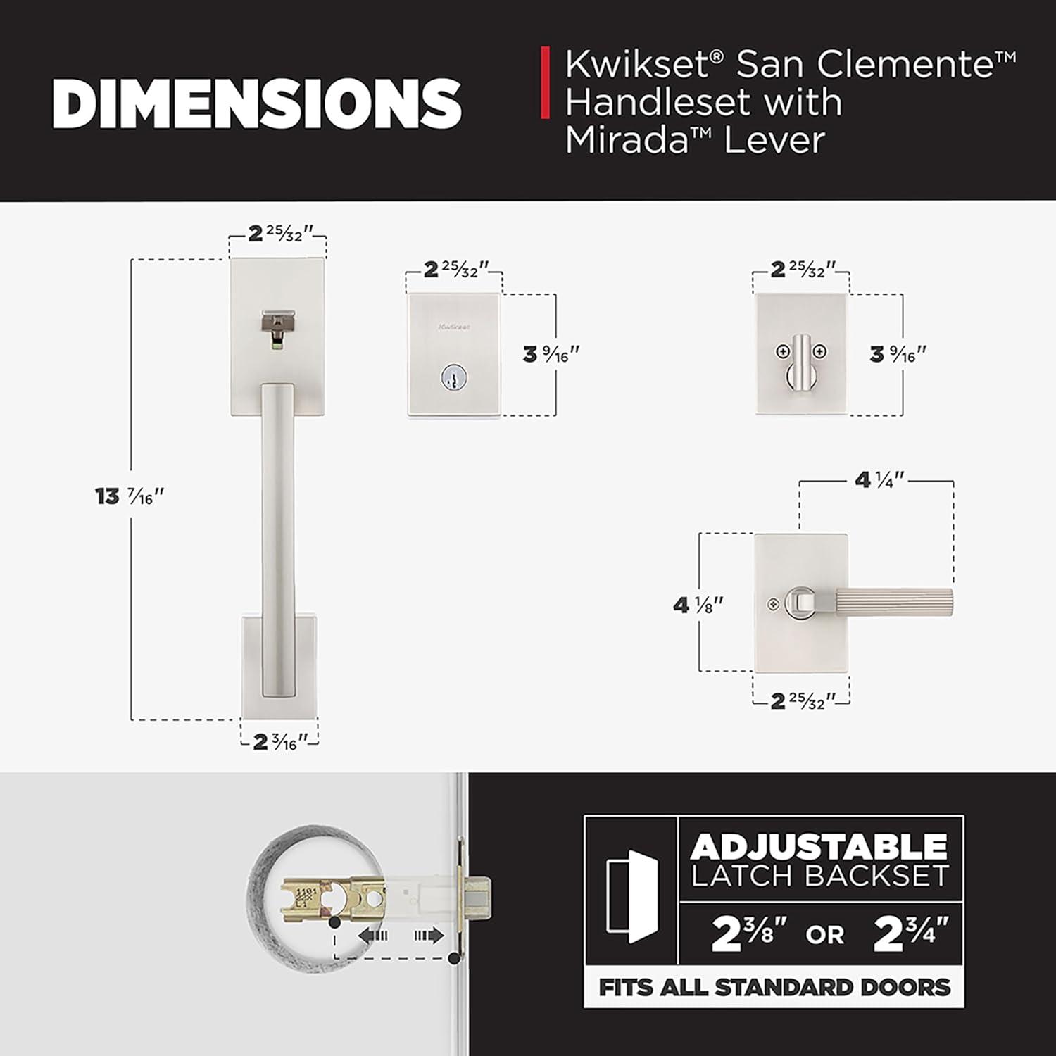 Save big on Kwikset San Clemente Front Door Lock Handle and Deadbolt Set, Entry Handleset with Mirada Reversible Lever, Matte Black, Pick Resistant SmartKey Rekey Deadbolt Security, with Microban Protection(Satin Nickel) during our summer blowout sale. Limited quantities available.