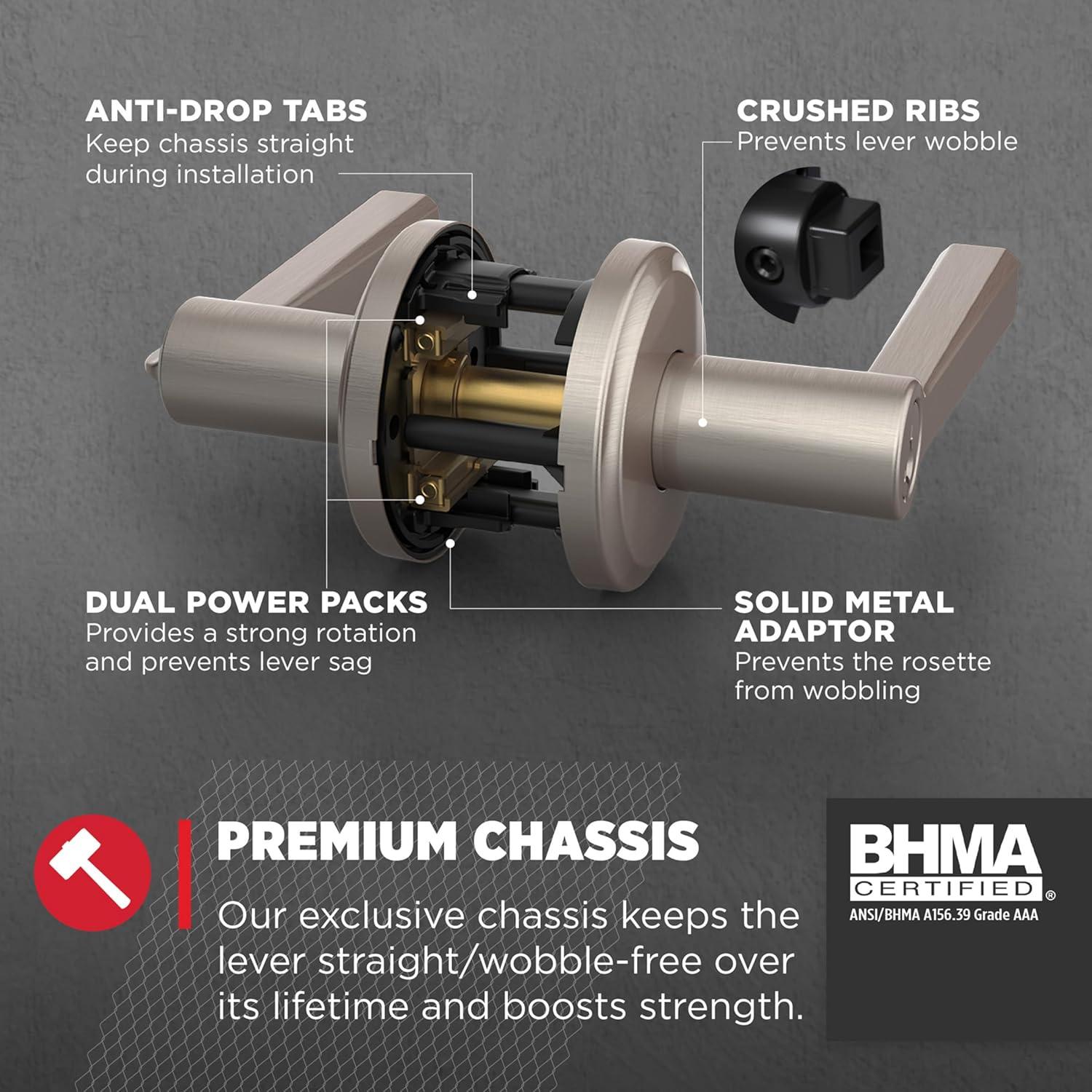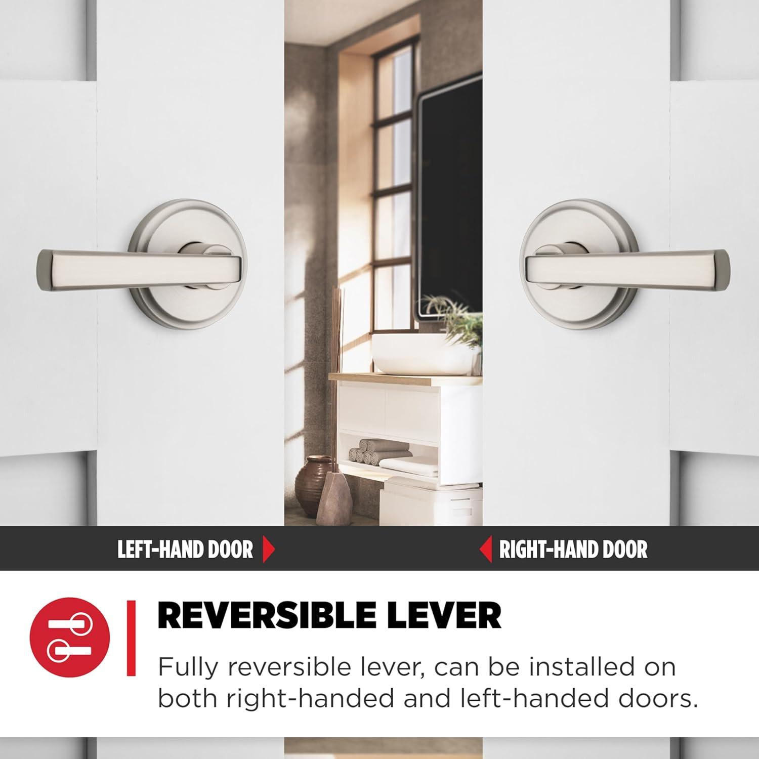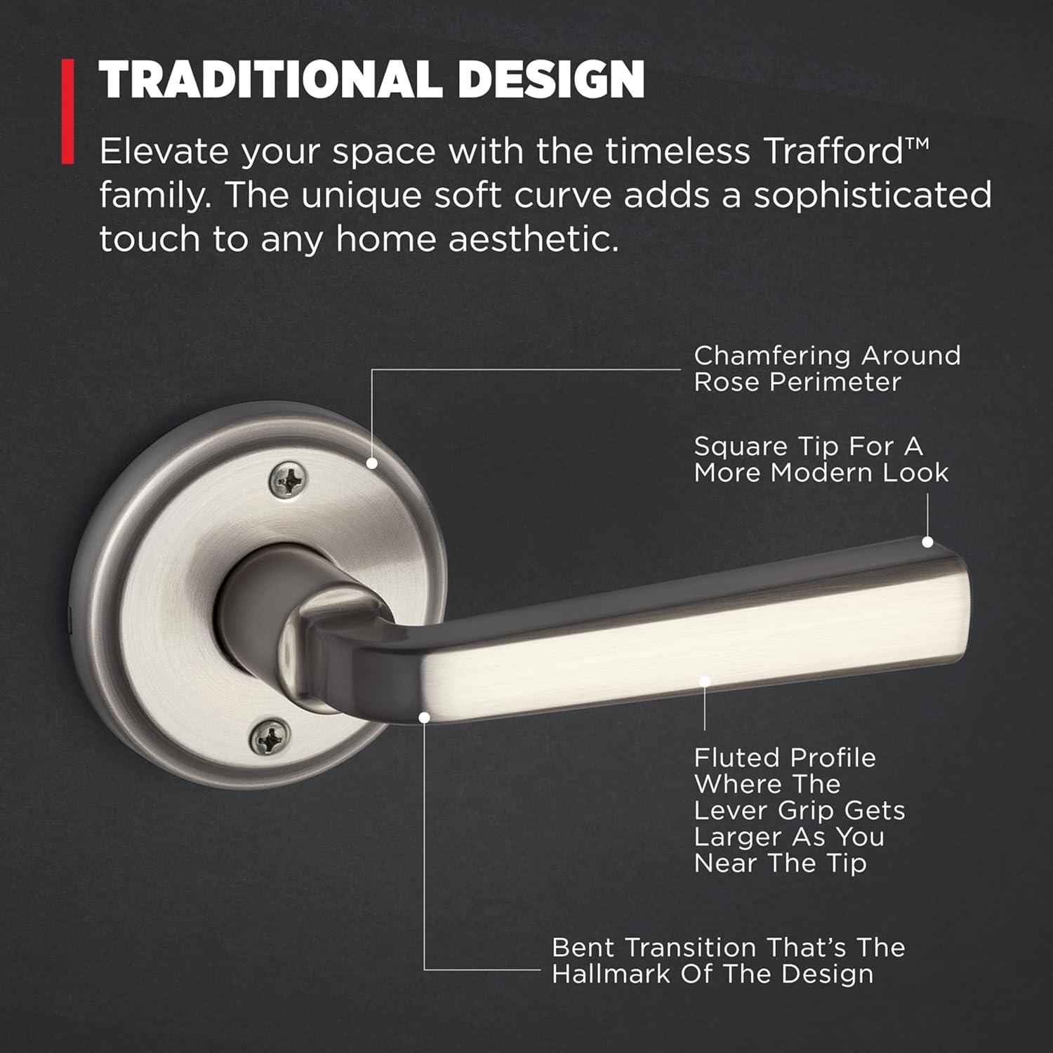 Elevate your space with the timeless Trafford family. The unique soft curve adds a sophisticated touch to any home aesthetic, while the designer rosette imparts a warm and welcoming feel to your doors. Create your desired look with three premium finishes, then let our bump- and pick-resistant SmartKey Security protect what matters most. Adorn your interior and exteriors with Trafford levers, and enjoy our highest level of security, easiest installation and peace of mind. Both levers can be operated by a key on the outside or thumb turn on the inside. The crisp, clean appearance of the Satin Nickel finish adds to the overall look of the product and brings a modern feel.